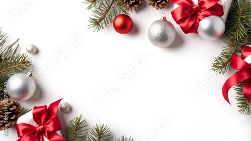 Christmas Themed Marketing Background with Border of Silver and Red Ornaments, Pine Needle Branches and Bows, on a White Surface