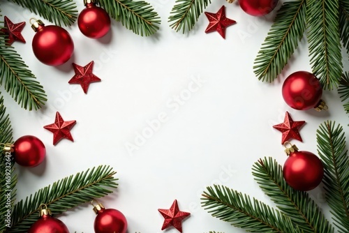 Christmas themed photo frame surrounded by ornaments White background, copy space Flat lay , bow, celebration, xmas