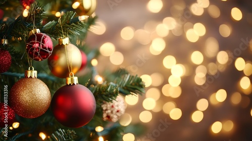 Christmas tree adorned with diverse ornaments and twinkling lights.