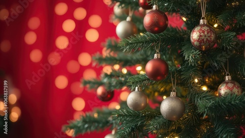 Christmas tree adorned with ornaments and illuminated by bokeh lights in a festive red background, tree