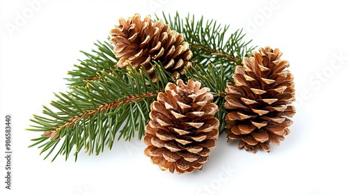 Christmas tree branch with golden pine cones isolated on a white background.