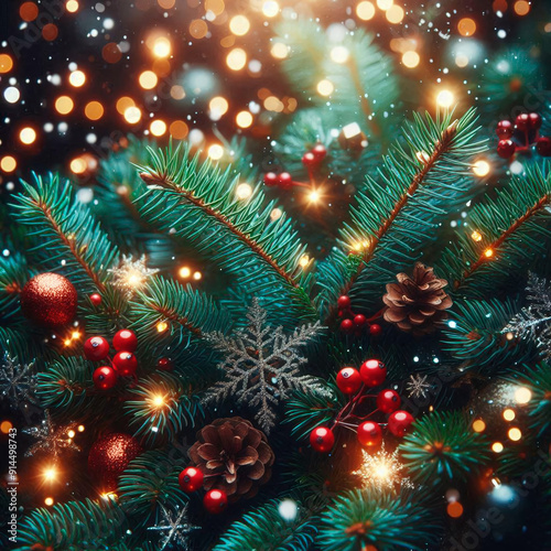 Christmas tree branches with pine cones and bokeh lights on background