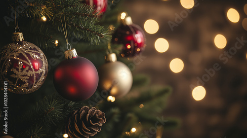 Christmas tree close-up, decorated with large red and gold ornaments, glowing string lights, and a few pinecones, cozy warm lighting, festive holiday mood