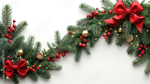Christmas tree corner border with green fir branches, red bow, berries and gold lights isolated on white background. Pine, xmas evergreen plants frame. garland decoration, card with copy space