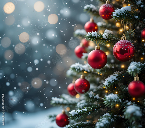 Christmas tree decorated red balls with snowfall and blurred light background