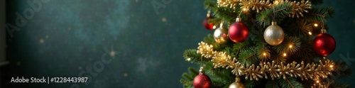 Christmas tree decorated with ornaments and garlands, winter evening, festive table setting, illuminated tree