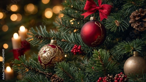 Christmas tree decorated with red and gold baubles and ribbon, creating festive atmosphere (Generative AI)