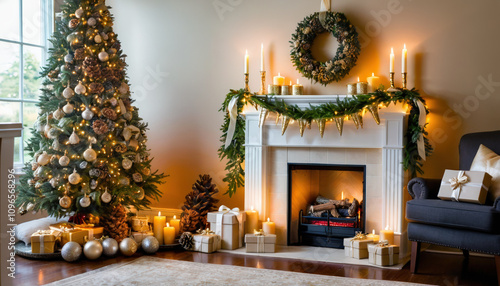 Christmas tree illuminating cozy living room with fireplace and gifts