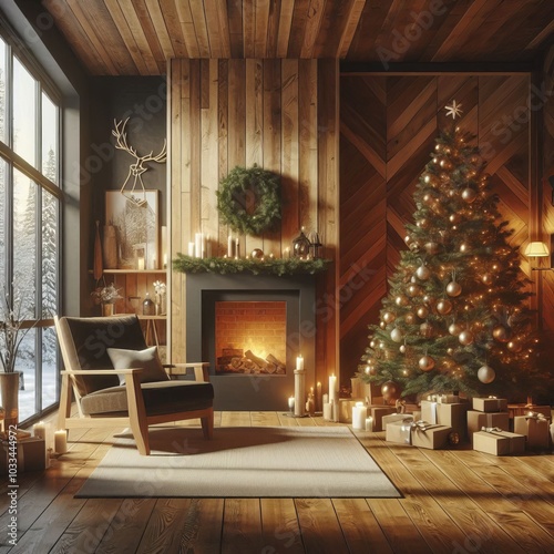 Christmas tree in front of a fireplace inside a cozy simple living room with empty walls and wooden floor