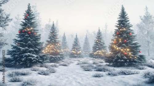 Christmas tree in snowdrift,winter and snow background, with Christmas ornaments glass transparent balls,banner sale product,Holiday Xmas background,vector illustration,space for text.