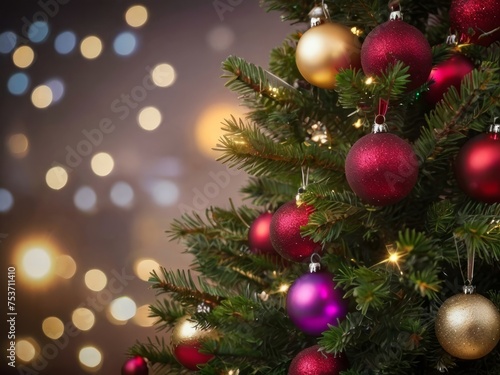 Christmas Tree With Baubles And Blurred Shiny Lights. Xmas tree and sparkle bokeh lights. Merry christmas card. Winter holiday theme. Happy New Year.
