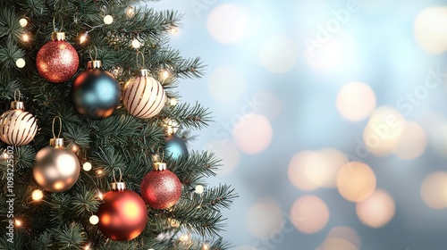 Christmas tree with glowing ornaments, soft background blur, 3D illustrationcloses up
