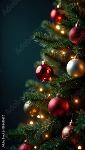 Christmas tree with ornaments and sparkly lights , snow, holiday