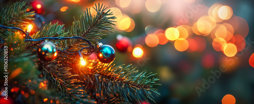 Christmas tree with ornaments, lights, and festive bokeh background