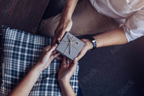 christmas, valentine, holidays gift box concept. Couple surprise gift box together.