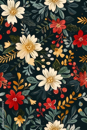 Christmas watercolor illustration, seamless botanical pattern of red and beige flowers, green leaves, and red berries on black background, for printing on fabric or wrapping paper