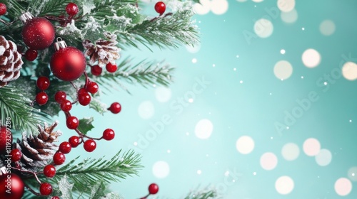 Christmas-themed background with pine branches, red ornaments, pinecones, and falling snow effect