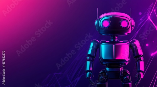 Chrome robot in glowing magenta and blue light