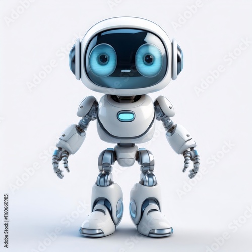 Chrome robot sporting oversized blue eyes, standing against pristine white surface