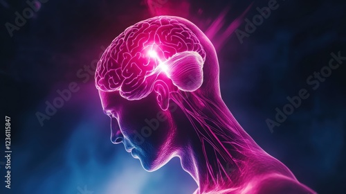 Chronic tension headache concept. A 3D render showing pain waves originating from the upper neck and radiating through the skull, with sharp