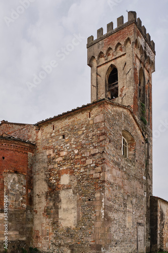 Church Badia Pozzeveri. Solo Backpacker Trekking on the Via Francigena from Lucca to Siena. Walking between nature, history, churches,
