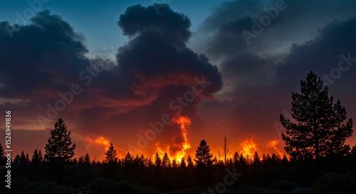 Churning Flames and Billowing Smoke: A Dramatic Sunset Illuminated by an Intense Wildfire in a Forested Landscape