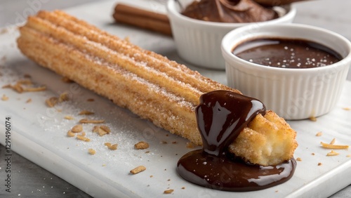 Churro Delight: A golden, crispy churro, coated in cinnamon sugar, is poised next to a decadent pool of rich, dark chocolate sauce and creamy dip.