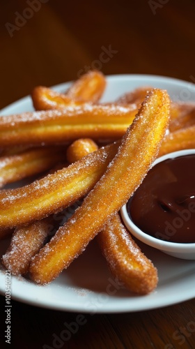 Churros with chocolate sauce on a wooden table. Selective focus