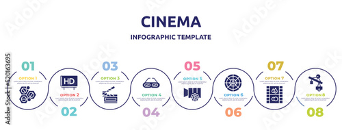 cinema concept infographic design template. included solid, hd, slapstick open, old 3d glasses, video tings, round carpet, image fotogram, jimmy jib icons and 8 option or steps.