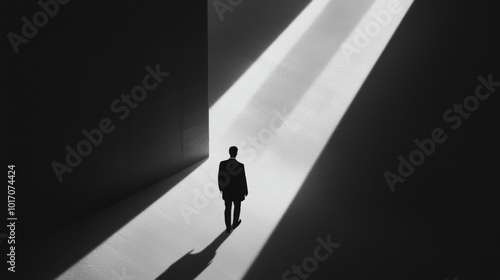 Cinematic Noir: Intriguing Shot of Man Walking into Darkness with Dramatic Lighting Path