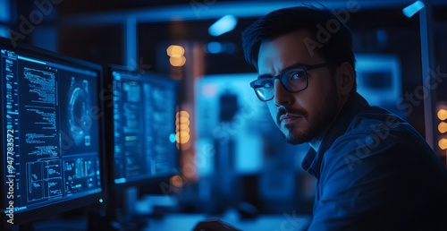 Cinematic shot of a male cybersecurity expert analyzing data on a computer screen in a dark office room