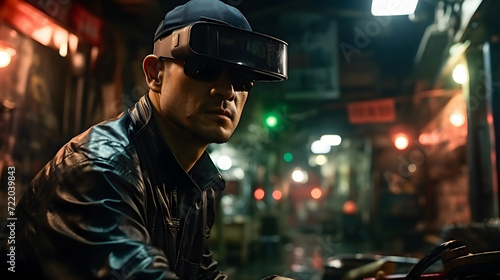 Cinematic shot of young guy with VR glasses are having fun to use augmented reality technology.