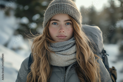Cinematic Street Photography of Young Woman with Long, Wavy Hair and Blue Eyes in Winter