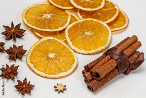 Cinnamon sticks tied in a bundle with a brown ribbon. Star anise and dry orange slices.
