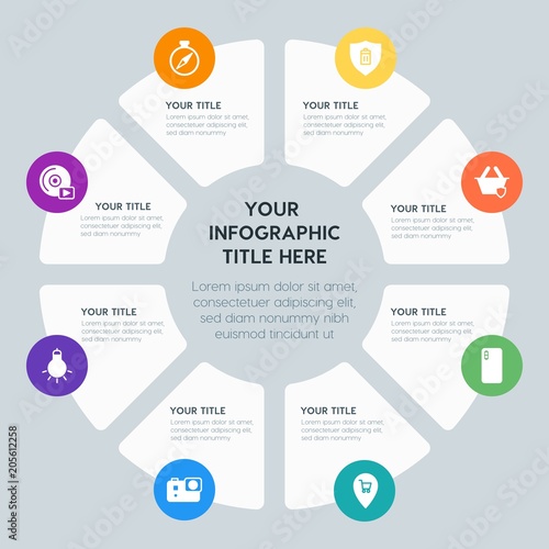 Circle chart location, security, video, photos infographic template with 8 options for presentations, advertising, annual reports