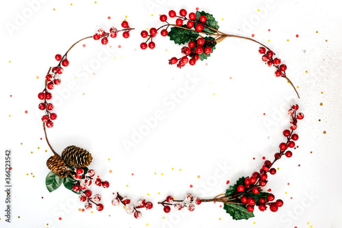 Circle frame as wreath from christmas red decoration with berries. White background decorated with confetti. Flat lay, place for text.