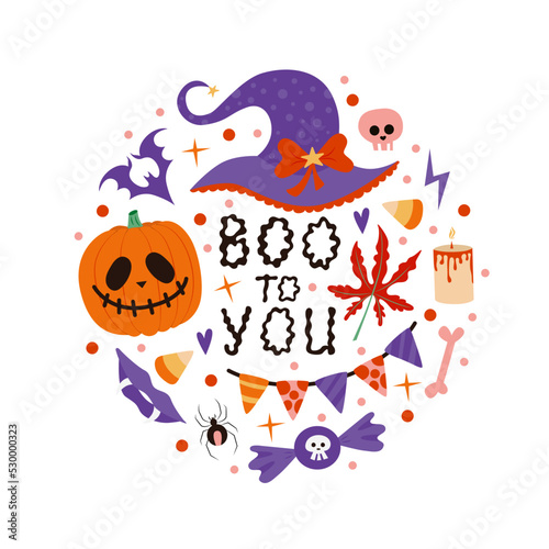 Circle Halloween composition with lettering phrase - boo to you. Set of wittch hat, skull, halloween sweets and pumpkin for card design
