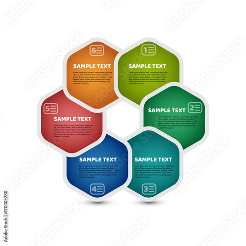 Circle infographic template with 6 steps. Corolful hexagons with sample text. For presentation and design concept. Vector illustration.