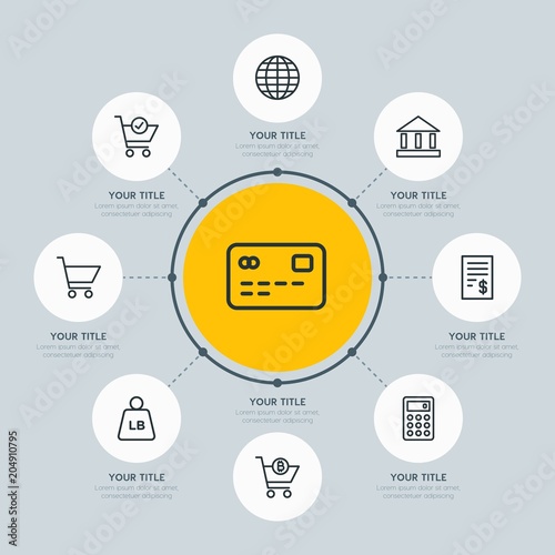 Circle network chart business, mobile, shopping infographic template with 8 options for presentations, advertising, annual reports.