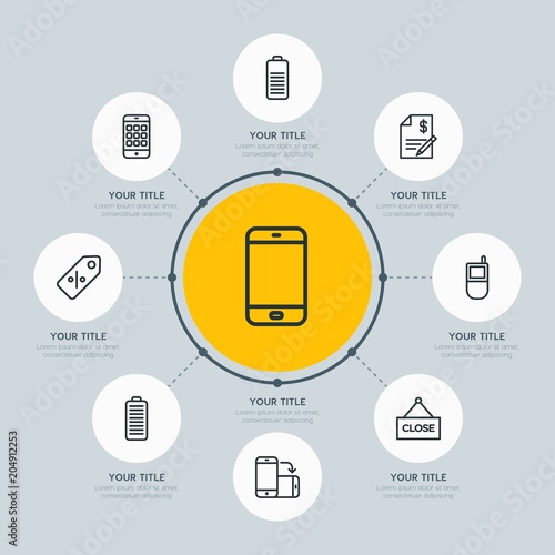 Circle network chart business, mobile, shopping infographic template with 8 options for presentations, advertising, annual reports.