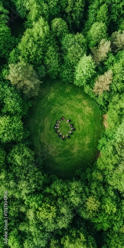Circle of People in Green Forest Surrounded by Lush Trees and Foliage