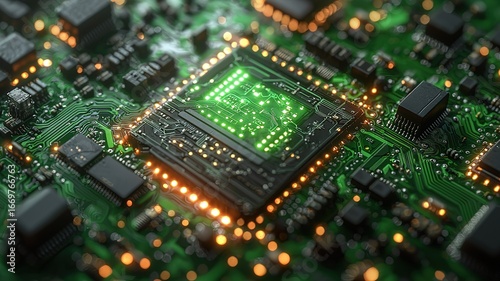 Circuit Board Chip Close-up - Glowing Semiconductor with Electronic Components for Technology Background