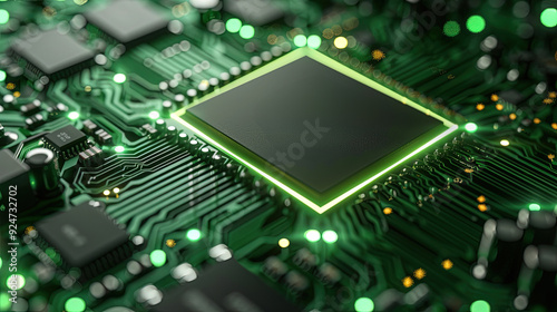 Circuit board microchips with green backlight. Nanotechnology sustainable background.
