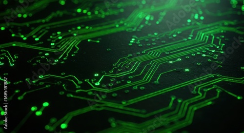 Circuit board texture, glowing green traces, dark background, detailed, tech, digital