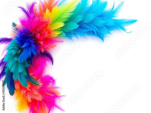 Circular arrangement of vibrant multicolored feathers against a crisp white background, with empty space in the center for text or design, design, vibrant, contrast