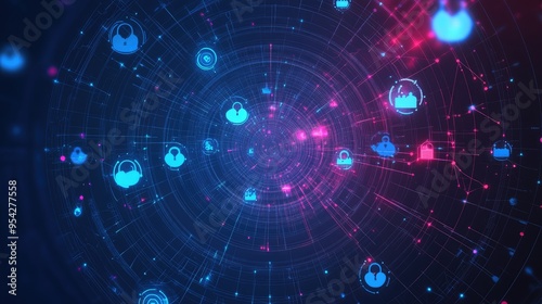 Circular digital patterns with radiating lines and icons, representing an online support community, no people