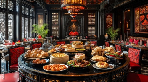 Circular dining table adorned with an abundant global feast, showcasing dishes like dim sum, tacos, croissants, and curries, surrounded by opulent decor