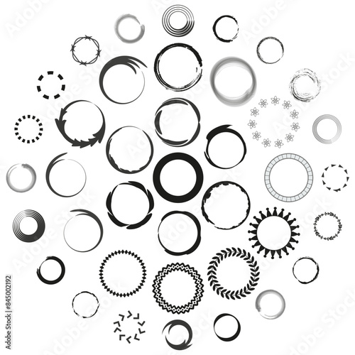 Circular frame collection. Various decorative designs. Black and gray vectors. Geometric pattern set.