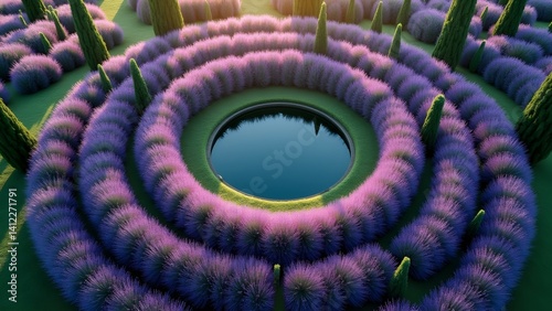 Circular Lavender Field With Reflective Pond and Topiary Trees. Aerial view of lavender field in summer.