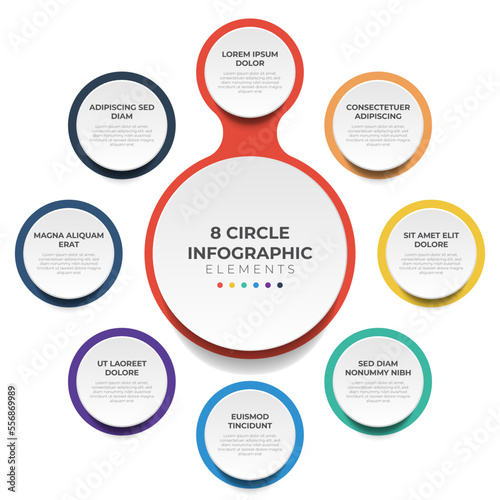 Circular layout diagram with 8 points of steps, sequence, colorful circle infographic element template vector.